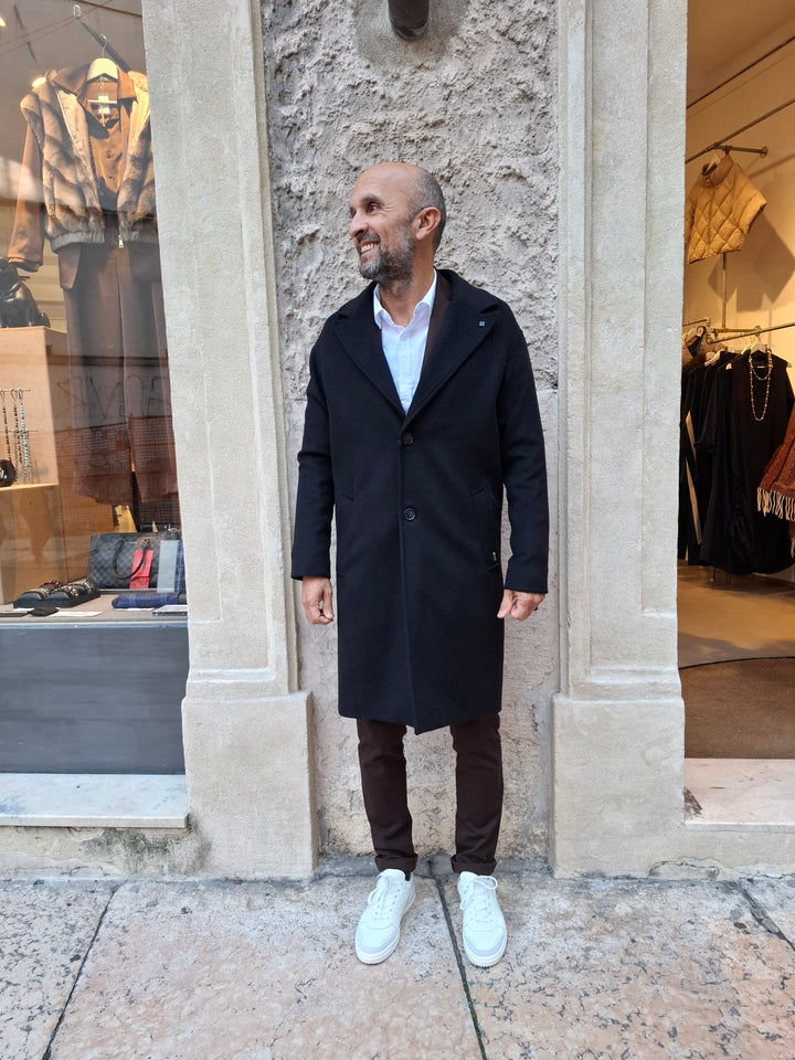 Cappotto monopetto realizzato in morbido tessuto nero e con fodera artistica