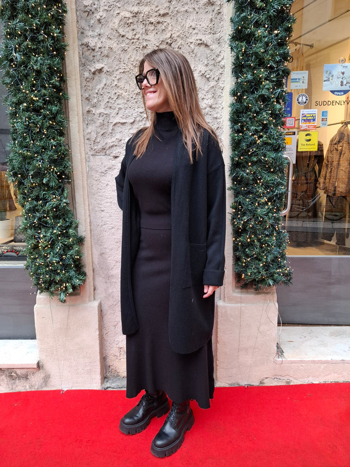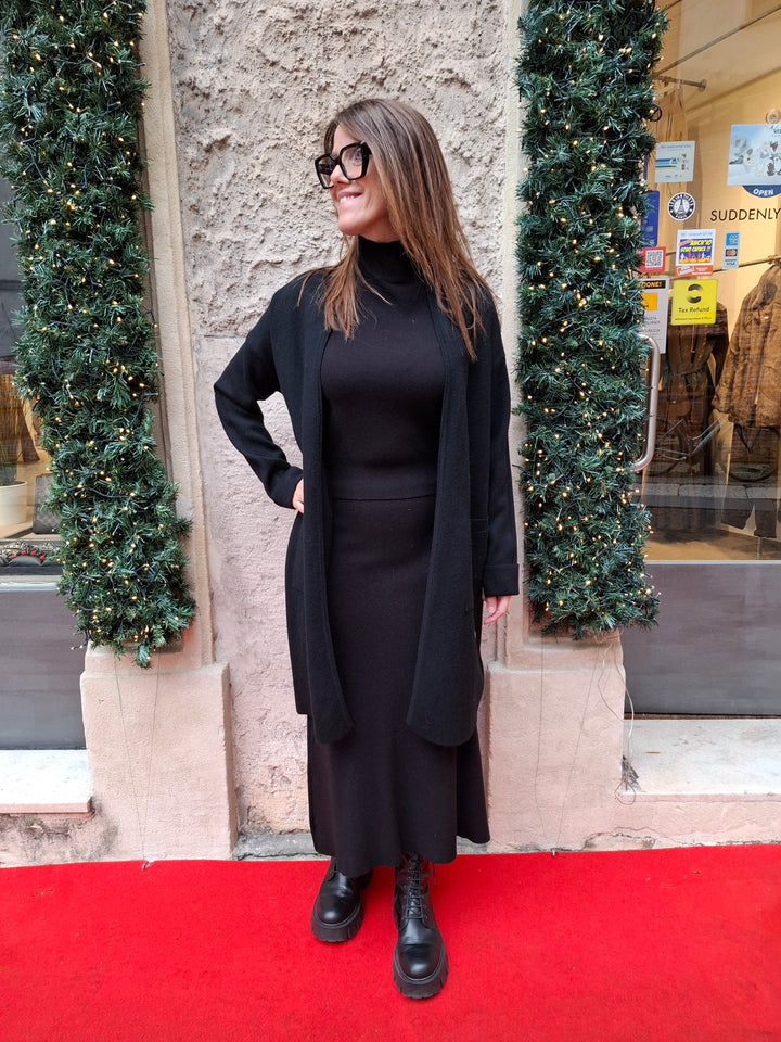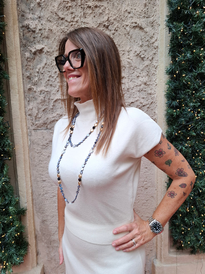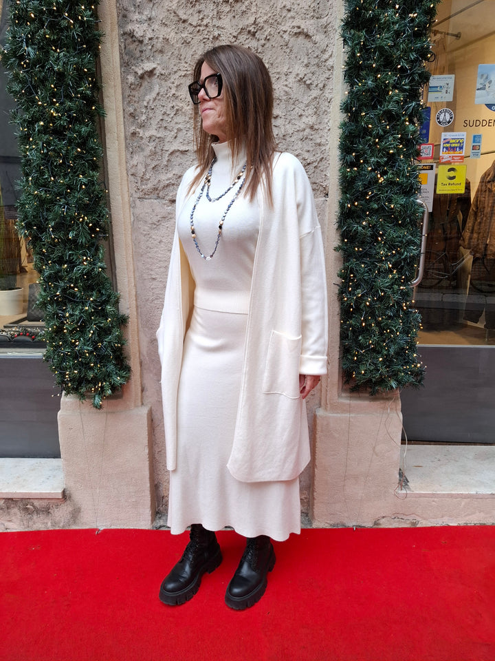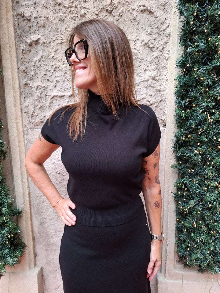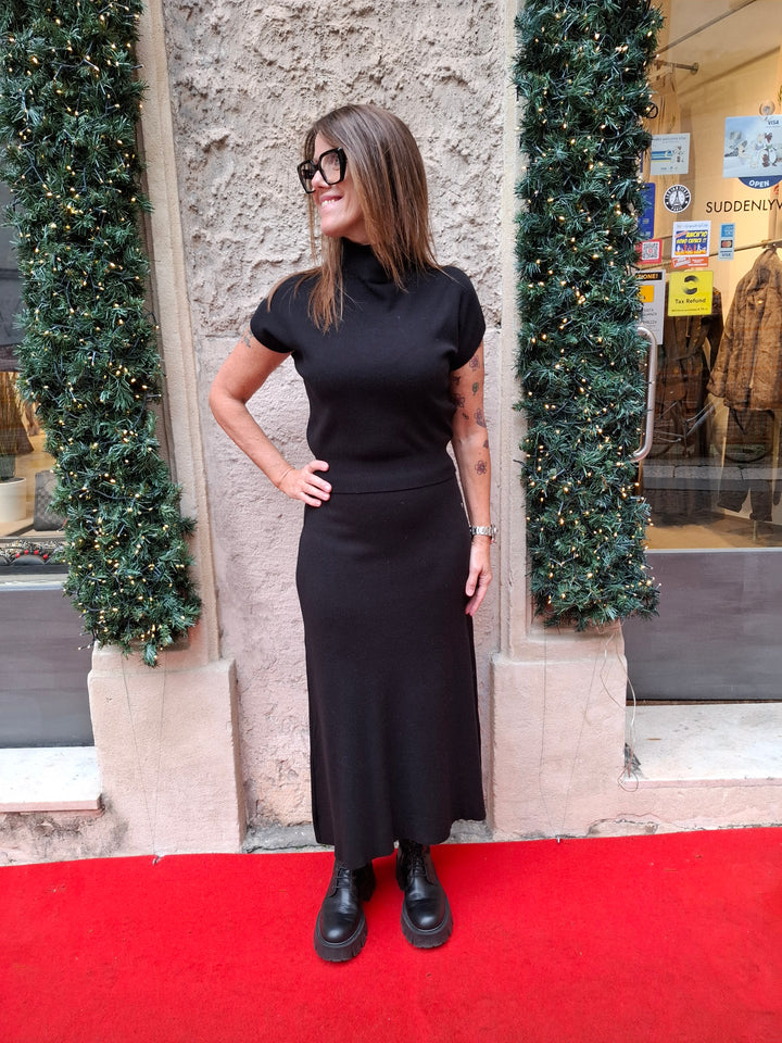 Completo in maglia composto da gonna e maglia con collo a lupetto.