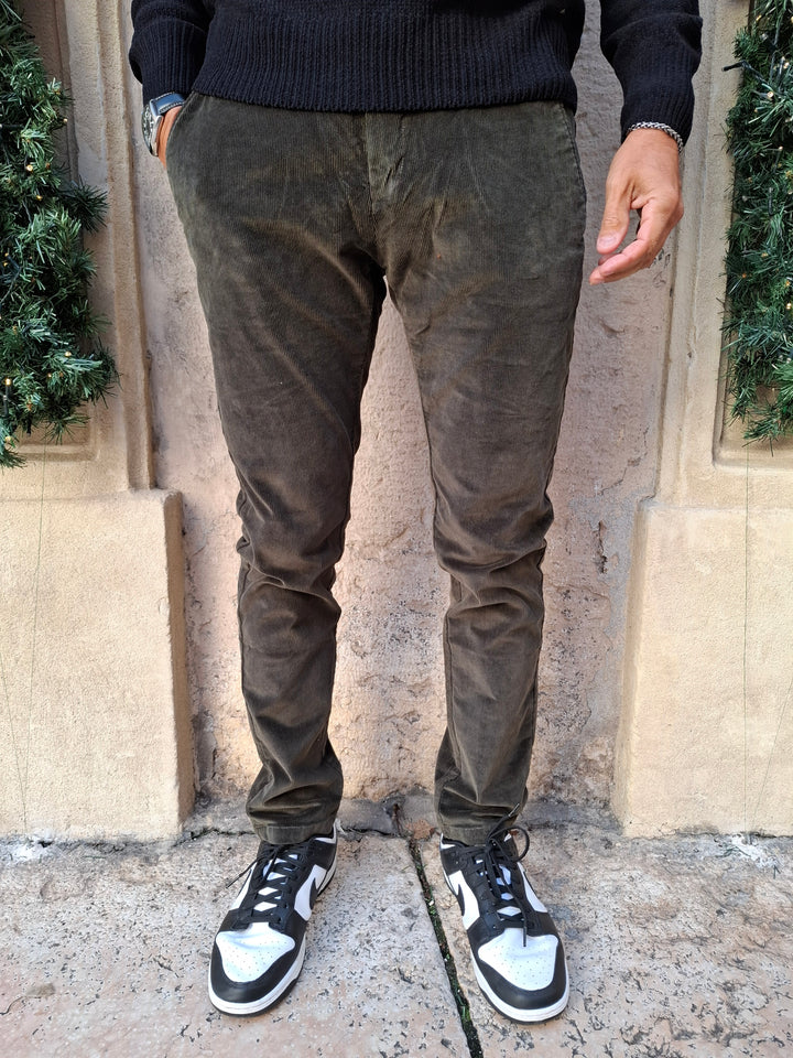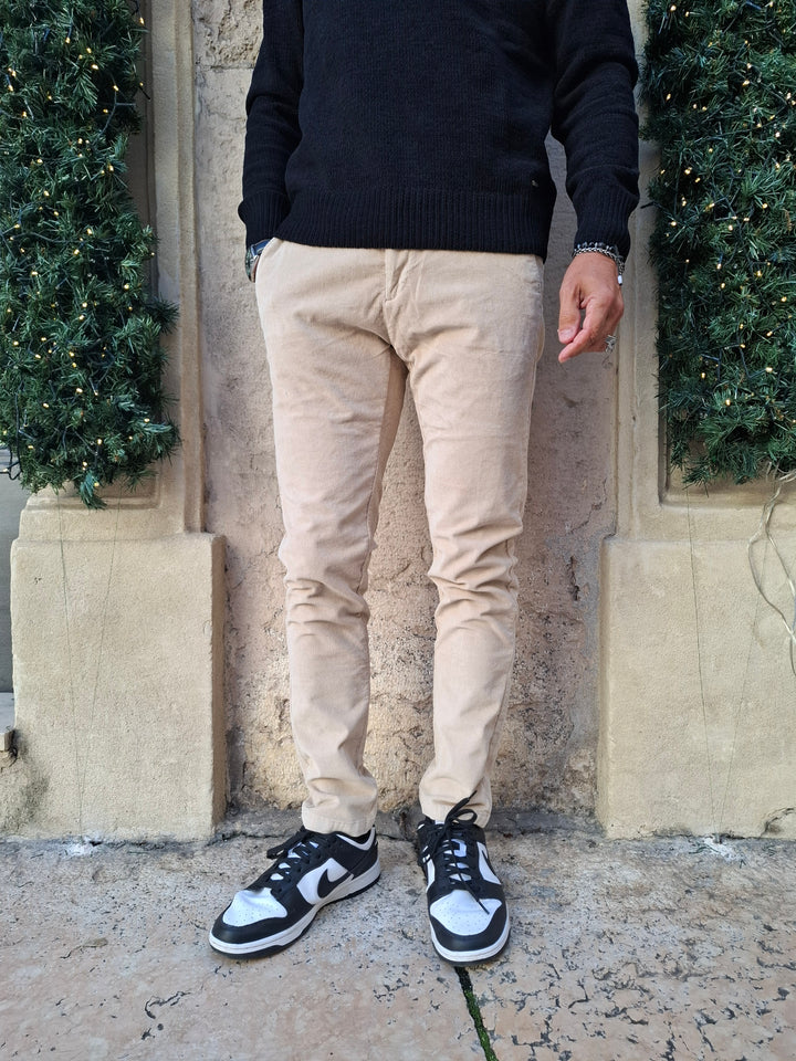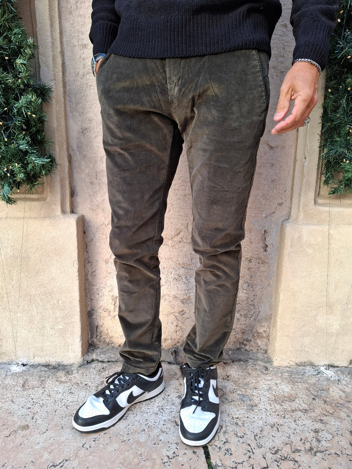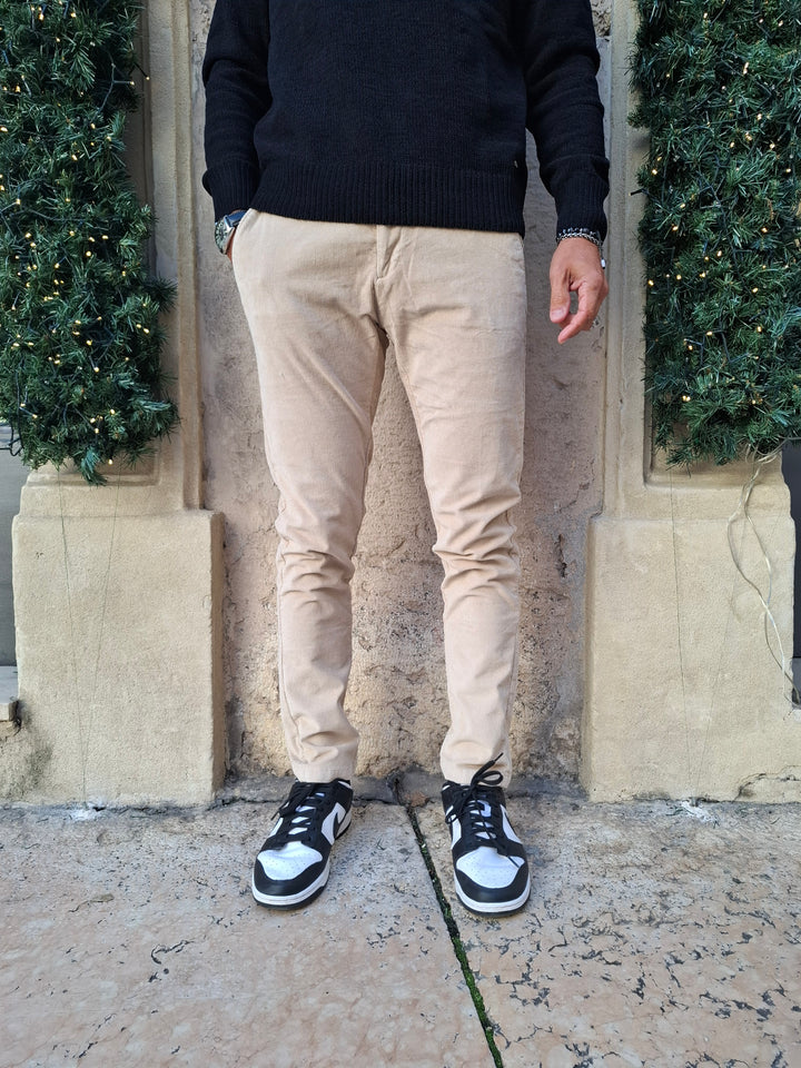 Pantalone a costine in velluto elasticizzato, vestibilità regular.